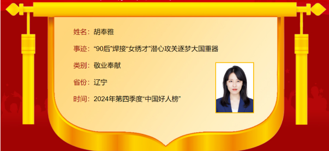 1月15日,2024年第四季度“中国好人榜”发布仪式暨全国道德模范与身边好人现场交流活动在云南省大理州举办。经各地推荐、网友评议和专家评审等环节,共有153个(组)助人为乐、见义勇为、诚实守信、敬业奉献、孝老爱亲身边好人光荣上榜。其中,鞍山胡奉雅上榜“中国好人榜”名单。