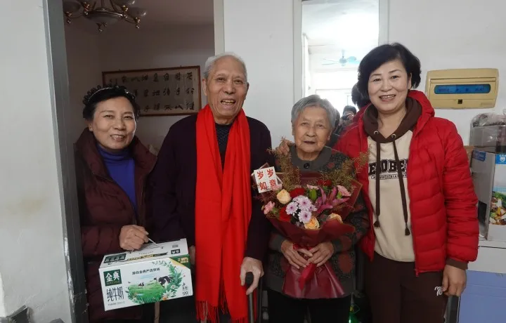 随后,杨素静和袁芬又来到92岁的老党员周玉桂家。周玉桂老人有72年党龄,亲眼见证了国家从“一穷二白”到“国富民强”的变化。老人接过鲜花高兴地说:“有你们的祝福,日子比蜜甜!”