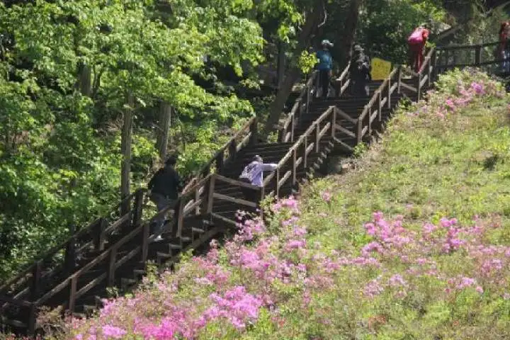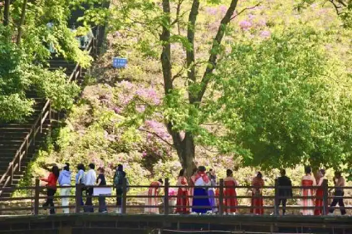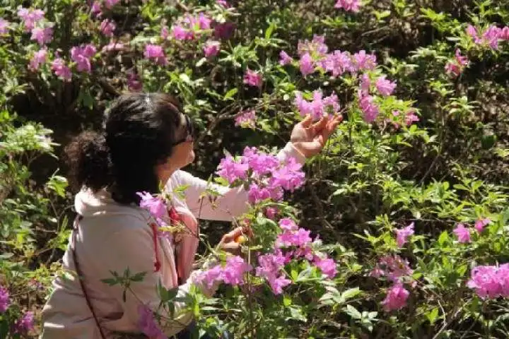5月15日,千山灵岩寺下坡的映山红迎来盛花期,满坡的花朵娇艳欲滴,吸引众多市民和游客前来赏花拍照。(来源:鞍山日报)