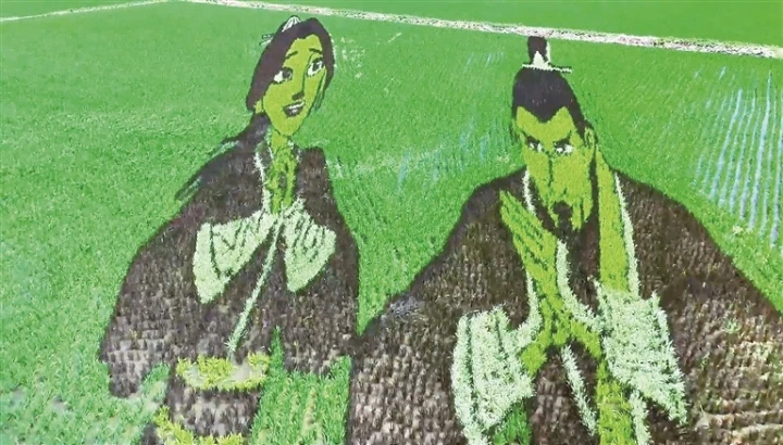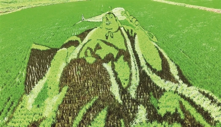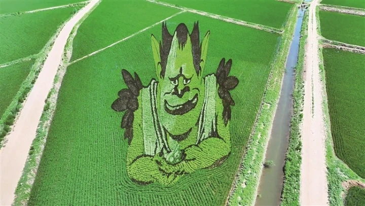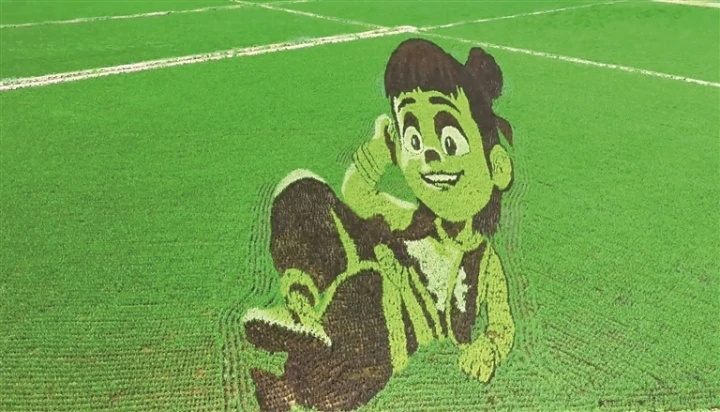 漫步在稻田间的观景步道,一幅幅巨型稻田画在稻穗摇曳间徐徐展开。哪吒脚踩风火轮、手持火尖枪的飒爽英姿,太乙真人憨态可掬的模样,还有结界兽、海夜叉生动的神态,都在稻苗的深浅交织中鲜活呈现。这些动漫角色仿佛突破银幕限制,跃然稻田上,既保留了传统农耕的质朴韵味,又注入了现代创意的灵动活力。