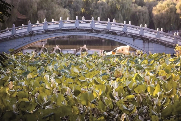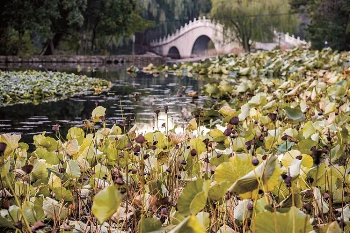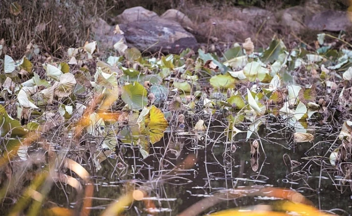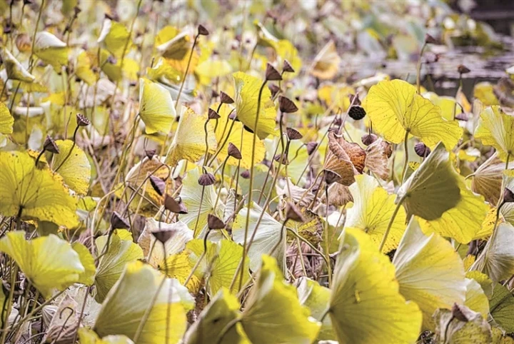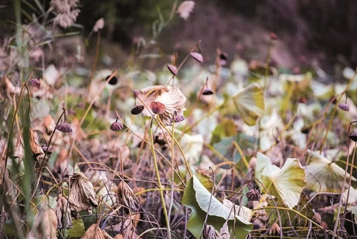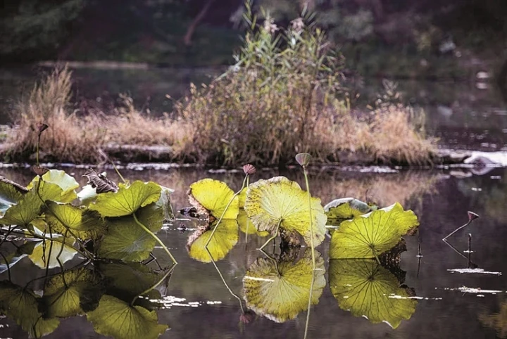 深秋的池塘里,残荷的茎秆半枯,有的蜷着焦边,有的留着半抹绿,像被时光晕染的水墨。风掠过水面时,几片残叶悄然落水,有的打着旋儿轻晃,有的贴着池面漂流,还有的半浸半浮,倒映出细碎的云影。它们以不同的姿态卧在碧波上,静静诉说着秋日独有的清寂与温柔。(来源:千山晚报)