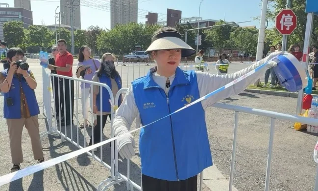 考试期间,志愿者们化身“秩序守护者”,劝导家长退至警戒线外,保持安静。烈日下,他们排成一排坚守岗位,汗水浸湿衣衫,却无人退缩。当天最后一科考试结束后,志愿者们顾不上疲惫,立即清理物资、归位物品。