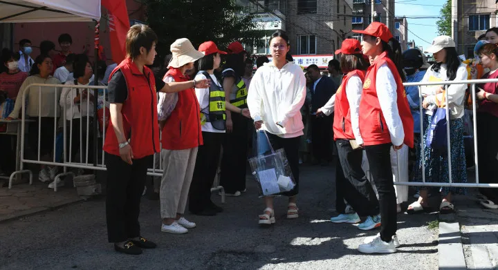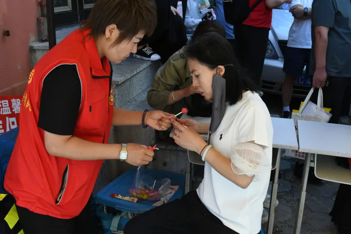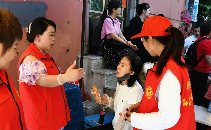 6月21日中考首日,华育中学考点外,一位家长突发低血糖。志愿者迅速上前,悉心照料,家长身体状况很快恢复平稳。考试期间,志愿者们还为考生和家长提供路线引导、物资补给等服务。他们用细心贴心的行动为中考保驾护航,成为考场外一道亮丽的风景线。 (来源:鞍山云)