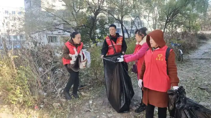 11月5日,立山区双山街道双卉社区,郭明义爱心团队“帮助别人,快乐自己”分队志愿者分工协作清理垃圾,将社区绿地、楼道等处垃圾杂物清理干净,让“志愿红”成为社区里一道暖心风景。(来源:鞍山日报)