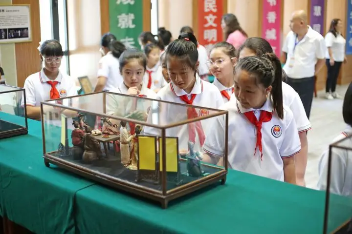 研学首站,色彩斑斓的非遗面塑展令孩子们驻足。栩栩如生的人物、惟妙惟肖的动物,都凝聚着海城面塑传承人的精湛技艺。