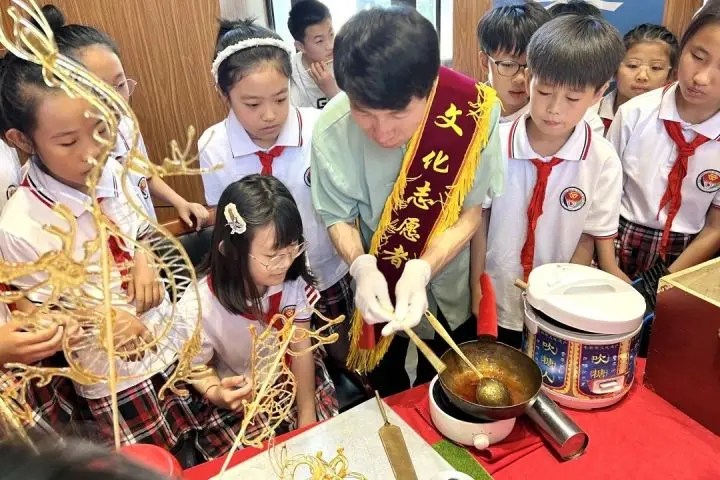 在糖画制作体验区,孩子们化身“小小糖画师”。熬糖、调温、勾勒,金黄色糖液在石板上流淌凝固,一只只灵动的蝴蝶、可爱的兔子呈现在眼前。孩子们捧着亲手制作的糖画,脸上洋溢着满满的成就感。