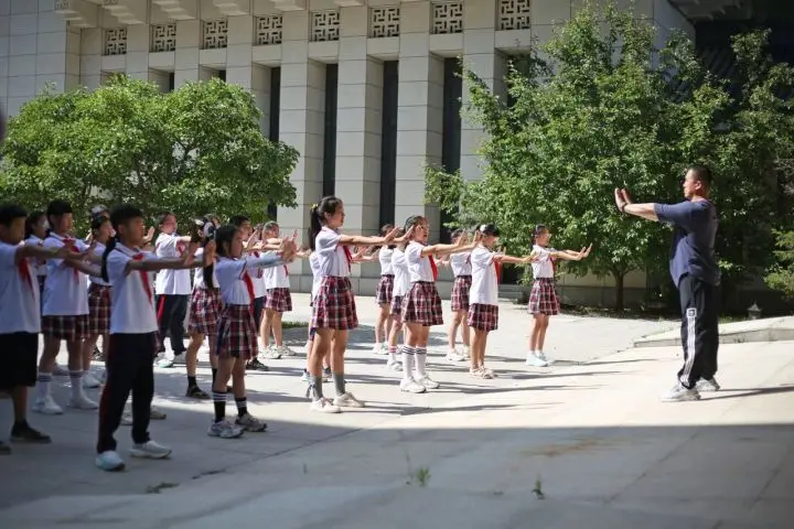 活动最后,孩子们跟随海城五行通背拳代表性传承人学习传统武术。