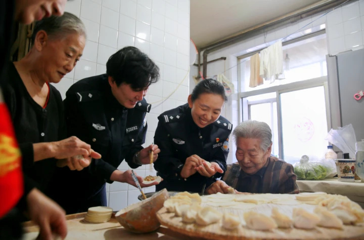 自担任九处社区民警那天起,石莹便和辅警把社区当成自己的家,辖区29栋1881户3593位居民成了自己的家人。每逢佳节,“自家儿女”服务队就回“爸妈”家,唠家常、打扫卫生、了解各家的急难愁盼。今年重阳节,恰逢辖区居民崔女士97岁生日,“自家儿女”服务队买菜、剁馅、和面、擀皮、包饺子……一大早便分工有序地忙活起来,为老人准备了一顿热气腾腾的“幸福馅”饺子。