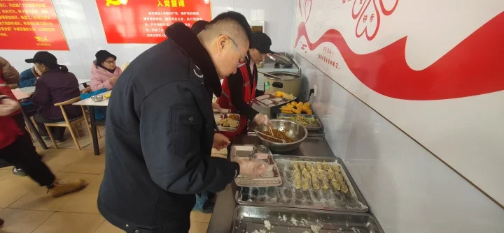 午餐时间,餐厅内老人们有序取餐。12名青年志愿者先将物资搬至厨房,随后主动上前为行动不便的老人打饭,把热腾腾的饭菜端到老人桌前,原本安静的餐厅顿时热闹起来,满是欢声笑语。