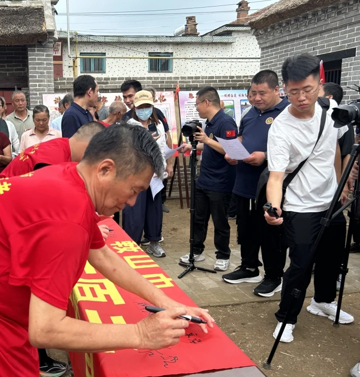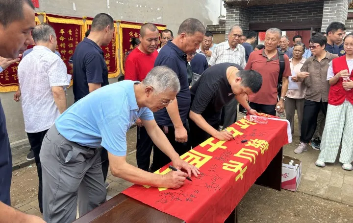 这时,《红色基因永传承》的旋律响起,现场瞬间安静下来,这是为此次联络站旧址重新开放专程创作的大张村抗日之歌。王京临姊妹与村民们自发列队,齐声高唱:“在那黄河岸边、渤海之滨有一个美丽的大张村,当年抗日烽火起,同仇敌忾一条心……不忘先烈洒热血,革命精神永传承。”鞍山和广饶两地乡音在歌声中交融,不少人边唱边擦拭眼角的泪水。歌声落幕,大家一同走到“传承红色基因”的条幅前,郑重签下自己的名字。墨色签名在红色底布上格外醒目,逐渐连成一片,如同燎原的星星之火。