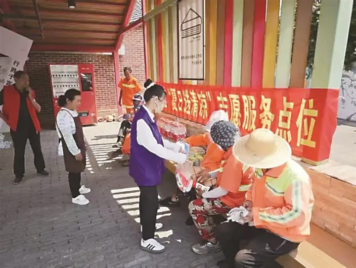 连日来,鞍山高温闷热,在千山区东鞍山街道的大街小巷,环卫工人依旧坚守岗位,用汗水换来路面的整洁。7月7日,东鞍山街道在鞍山城村和对桩石村设立了两处“夏日送清凉”志愿服务点位,为30多名环卫工人准备降温物资。“这几天下雨,挺闷热的,一动就出汗,这个小电风扇真是太及时了,还方便携带,特别好。”环卫工人王桂英说。一旁的高素娟清扫完自己的片区,听到有送清凉的活动就马上过来看看,“虽然今天扫完的还算早,但热气也开始上来了,我看还发冰棍,就想来一根凉快凉快。”高素娟一边说着,一边摘下帽子擦汗。