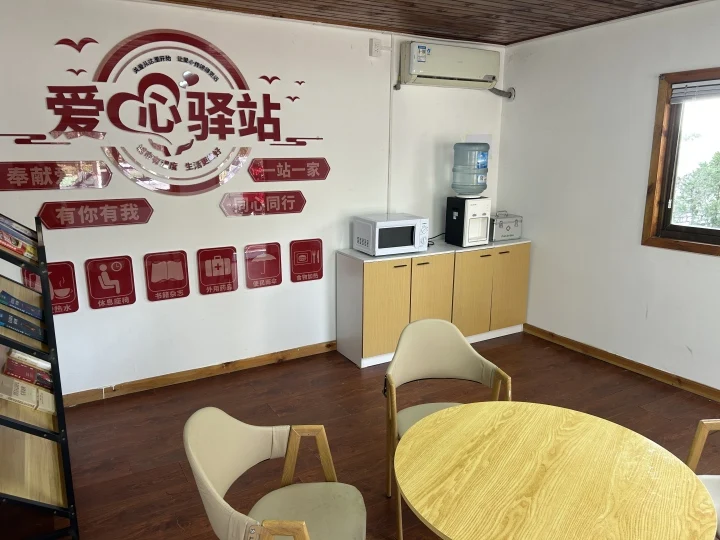 走进小屋,16平方米的空间整洁明亮:墙壁粉刷一新,浅色调让室内更显通透;窗边的木色小圆桌搭配4把椅子,桌角圆润避免磕碰;靠墙的木柜上,微波炉、饮水机与急救箱依次摆放。另一侧书架上,党建期刊、小说等书籍整齐排列。