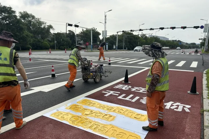 6月24日启动的千山东路修复养护工程,全长8.213公里,主路宽28米,两侧辅路宽7米。起点位于庙尔台村,终点位于千山东路与东环路交叉处。开工以来,在市交通运输局、市交通运输事务中心的精心组织下,施工单位积极优化施工方案,增派作业力量,实行24小时轮班制,全力推进工程进度。千山东路主路提前通车的背后,凝结了百余名施工人员连续近30个昼夜奋战的汗水;包含着市委、市政府及公安交管等多部门的协同,从施工方案审批,到交通导改协调的全程“绿灯”护航。道路上清晰的红色防滑标线及橙白结合的宣传语“我在千山等你”,既提升了道路辨识度,又给这条道路增添了人文情怀。